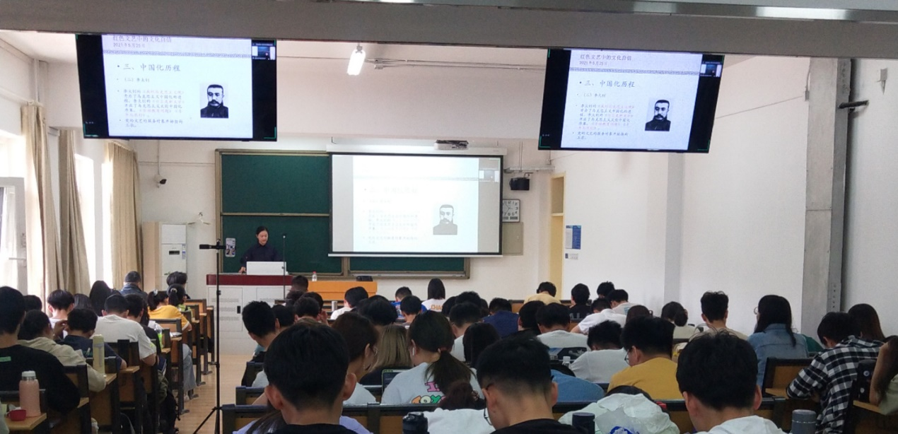 授课伊始,林苗苗老师以“红色文艺的使命与担当”引言导入,结合中国共产党建立百年的关键节点聚焦红色文艺,从红色文艺的理论溯源到文化自信的本土自觉、从马克思主义的文艺理论到中国特色社会主义文化自信,深入进行理论探讨和历史分析,全方位论证马克思主义文艺理论为中国共产党人领导文艺运动提供不竭的思想源泉。授课内容聚焦“党的领导”和“以人民为中心”两个重要维度,用历史和现实的双重视角引导广大青年身处新时代、新起点、新征程的时代背景下,践行党的初心使命、积极学习党史理论知识和红色革命文化,牢固树立实现中华民族伟大复兴梦的坚定理想信念。